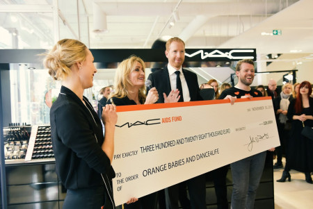Dance4Life via het M.A.C Aids Funds (MAF). Brand Manager Benelux van M.A.C Cosmetics Pieter Hertecant overhandigde de cheque ter waarde van € 328.000 aan de ambassadeurs. Natasja Froger deed dit namens Orange Babies en Anika de Groot in naam van Dance4Life. Deze geweldige donatie geeft ons de mogelijkheid om onze projecten op succesvolle wijze voort te zetten. Naast de ambassadeurs hebben ook BN'ers en influencers zich vandaag in de winkel én online ingezet voor World Aids Day. Dit zijn onder andere Barbara Sloesen, Stijn Fransen, Martijn Koning, Mayday, Loes van Delft, Dominique Candido, Esmee Rudolf, Graziella Ferraro, Cato van Ee, Maureen Powel, Bas Kosters, The Fashion Composers en Joshua Walter.