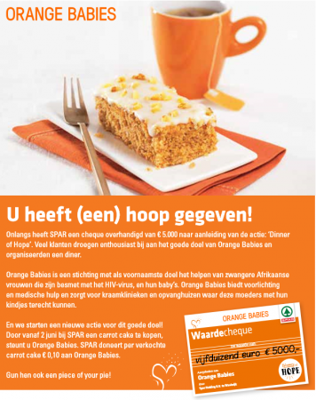 Onlangs heeft SPAR een cheque overhandigd van € 5.000 aan stichting Orange Babies naar aanleiding van de actie: ‘Dinner of Hope’. Veel klanten droegen enthousiast bij aan het goede doel van Orange Babies en organiseerden een diner voor vrienden of familie. De opbrengst daarvan kwam ten gunste van het goede doel. SPAR bouwt de samenwerking met Orange Babies de komende tijd verder uit. Door vanaf 2 juni bij SPAR een carrot cake kopen, steunen klanten Orange Babies. SPAR doneert namelijk per verkochte carrot cake € 0,10 aan Orange Babies.